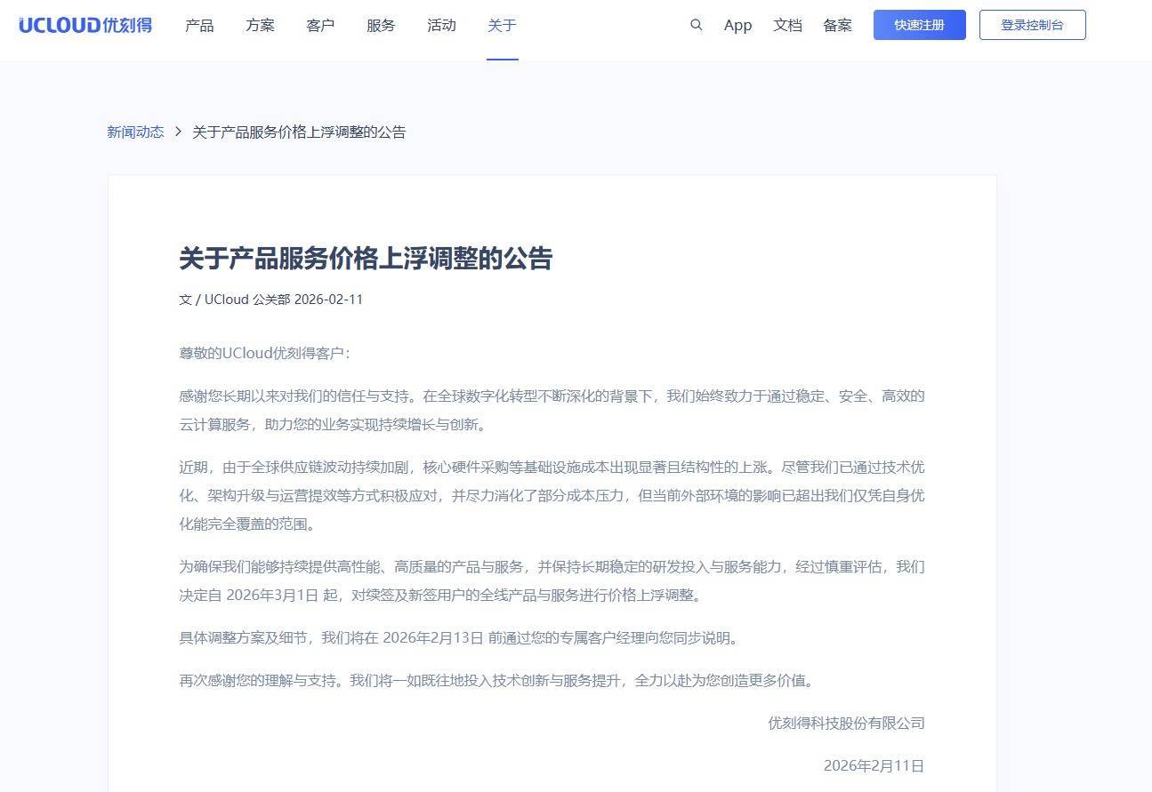 消息面上,2026年2月11日,优刻得发布关于产品服务价格上浮调整的公告。优刻得表示,近期由于全球供应链波动持续加剧,核心硬件采购等基础设施成本出现显著且结构性的上涨。经过慎重评估,优刻得决定自2026年3月1日起,对续签及新签用户的全线产品与服务进行价格上浮调整。