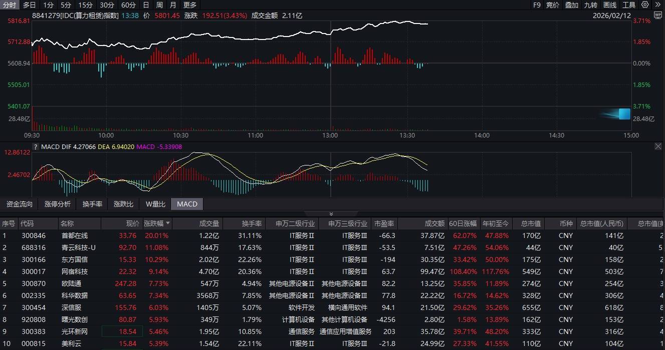 午后算力租赁概念持续拉升,首都在线封20cm涨停,此前优刻得、大位科技、金开新能涨停,并行科技、汇金科技、东方国信、青云科技、网宿科技等多股涨超10%。