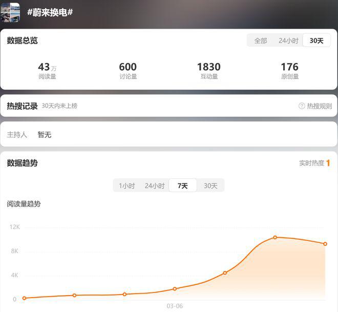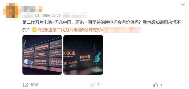 而在比亚迪抛出闪充技术后,迅速引发网友的讨论。在 3 月 5 日发布会后的几天,关于“蔚来换电”之类的话题在社交媒体平台的浏览量出现了明显的上涨。